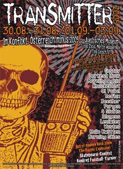 Dienstag, 30.08.2005 Martin Wassermair Luisa Ziaja Mittwoch, 31.08.2005 Tina Leisch Sylvia Riedmann Donnerstag, 01.09.2005 Gustav Art Of Modern Rock Freitag, 02.09.2005 Reflux Purgen Beecher Darkest Hour Inkpot Tattoo Art Of Modern Rock Morning Again Burning Skies Diagens Samstag, 03.09.2005 Konkret Fussball Turnier 4 Sivits Hallo Kwitten Wasted Oi Polloi Skateboardcontest Knuckeldust Leniwiec Inkpot Tattoo Art Of Modern Rock Weitere Informationen: Bernhard Amann Im Sohl 1 6845 Hohenems Österreich Mobile: 0043(0)664/340 20 10 E-Mail: bernhard.amann@aon.at Webseite: www.transmitter.at Hauptseite | |