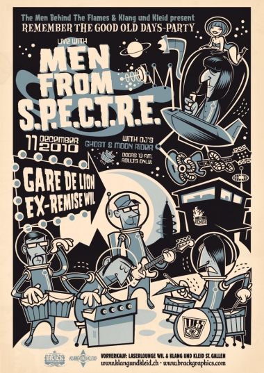 ![]() ![]() Plakat kaufen Remember The Good Old Days...Lasst uns erneut den alten Remise Tagen gedenken und feiern....Men from S.P.E.C.T.R.E. rasen aus den Deinen Lautsprechern, ab durch die Wohnung, rein ins Ohr und bringen Deinen Puls auf Trab. Der Sound passt zu Strassenrennen mit frisierte Boliden, als auch zu Werbefilmen der NASA. Seine Ecken und Kanten hat der instrumentale Action-Sound den Space-Rock-Bands und Soundtracks der 70er abgeschaut. Ein packender Beat aus Drums, Congas und Bass sowie eine wilde Hammond und eine zerzauste Gitarre mischen dabei die Szenen auf. Mit The Living Eye legen Men from S.P.E.C.T.R.E. ihre dritte CD vor, welche auf dem amerikanischen Label Hammond Beat Records erscheint. The Living Eye ist ausschweifender und psychedelischer als seine Vorgänger-Alben und setzt bezüglich Beat noch einen oben drauf. Die Tracks Purple Pill People und Black Tank des neuen Albums erscheinen wie auch schon frühere Produktionen auf internationalen Labels wie Acid Jazz (UK). Bisherige Konzerte führten Men from S.P.E.C.T.R.E. durch Italien, Spanien, Grossbritannien, Deutschland, Belgien, Frankreich und die Schweiz. Die Band wird mit dem neuen Material auf ausgewählten Bühnen zu sehen sein und für eine Menge Ärger sorgen.