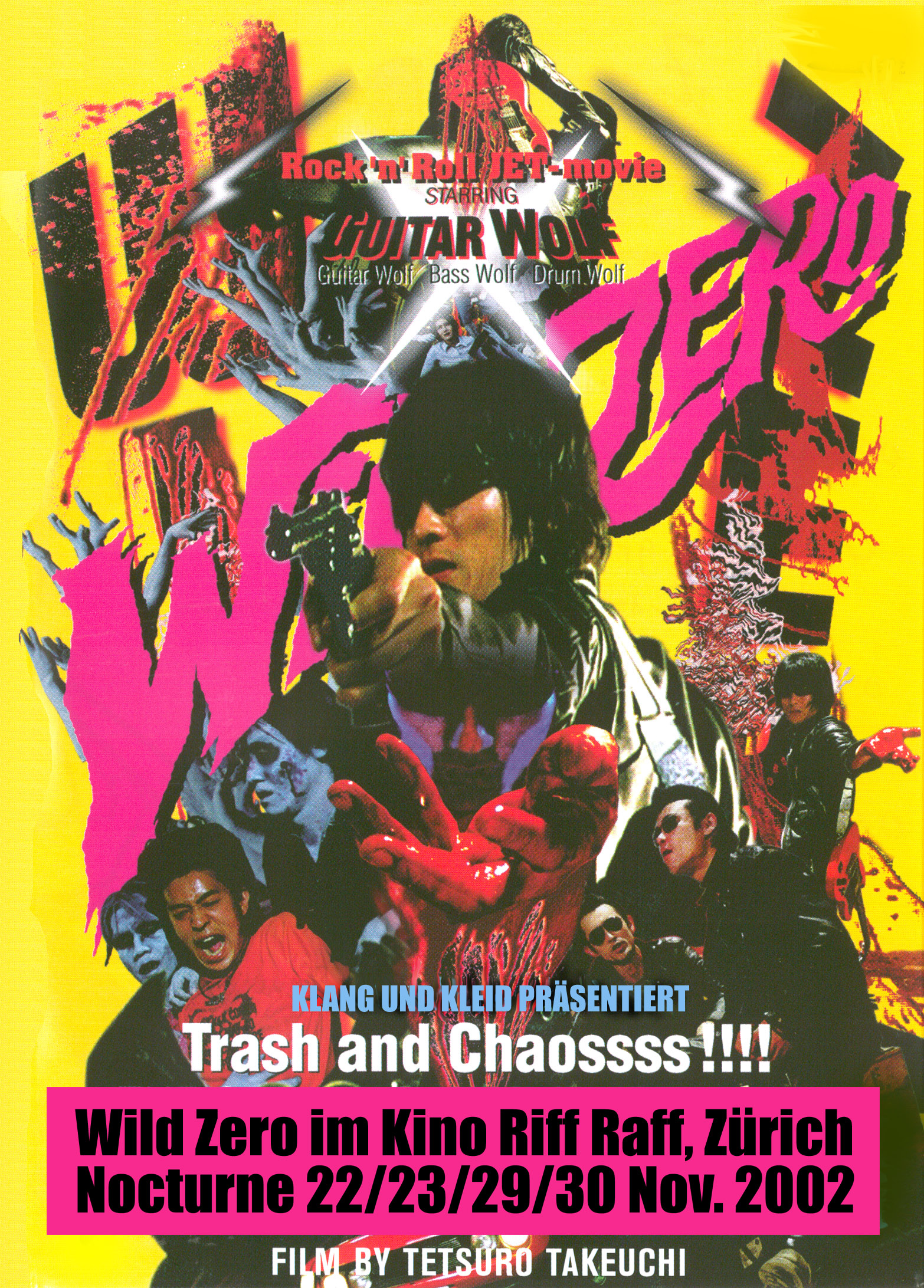 Seiji aka Guitar Wolf, Billy aka Bass Wolf und Toru aka Drum Wolf gründeten Ende der 80er Jahre alle 18 jährig in Tokio die Band Guitar Wolf. Ihre Musik wird durch grosse Mengen Alkohol und Einflüssen von Link Wray, Joan Jett und Johny Thunders genährt und nennt sich "Jet Rock". Ihre Liveshow ist chaotisch, viel booze und fun. Im diesen Sinne let's lock'n'loll! Der ultimative Movie-Concert-Combo Event: Nebst dem Konzert am 28. November 2002 mit "Guitar Wolf" den Protagonisten des japanischen Kult-Zombie-Films "Wild Zero" wird bereits am Wochenende vorher und das danach, am 22., 23., 29. und 30. November 2002 gleich auch noch der Film selbst im Kino RIFFRAFF, Zürich gezeigt!